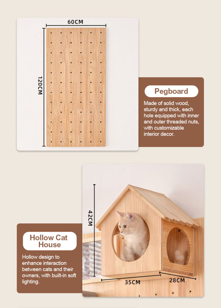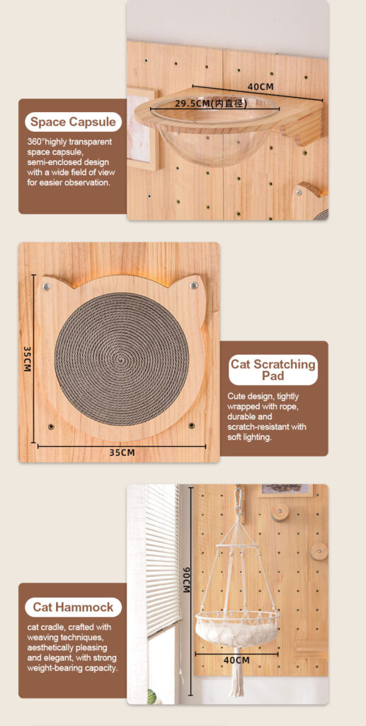 It offers a DIY cat climbing frame that combines fun and functionality. Crafted from solid wood, its wall-mounted design allows endless mix-and-match combinations, adapting to any home space.