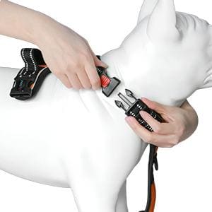 After properly positioning the dog harness on your dog’s body, buckle both neck and chest buckles.